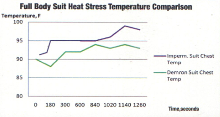 實驗條件:工作人員身穿不同防護服,以3.5英里/小時的速度在跑步機上慢跑10分鐘后測量全身防護服的溫度。藍色曲線代表通用防護服,綠色曲線代表使用Demron材料制成的防護服。