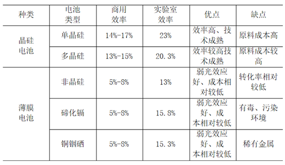 太陽能電池主要有以下幾種類型:單晶硅太陽能電池、多晶硅太陽能電池、非晶硅太陽能電池、碲化鎘電池、銅銦硒電池等。