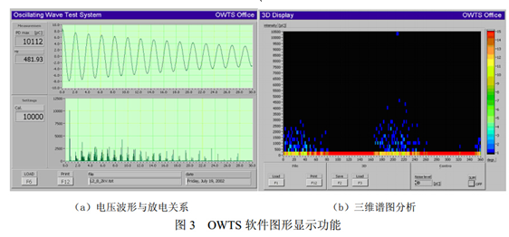 OWTS振蕩波電纜局部放電檢測和定位裝置具有帶通濾波、小波分析、時延分析等抗干擾功能,可根據信號特點,方便的進行放電脈沖的取舍,如圖2所示。該裝置還可以生成清晰的局部放電圖形(如電壓波形與局部放電信號關系圖、三維譜圖等),以便確定局部放電的類型,如圖3所示。