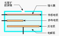 電化學測試方法又稱為定電位電解法,是*對二氧化硫的標準測定方法之一。(HJ/T 57-2000《固定污染源排氣中二氧化硫的測定定電位電解法》)。其核心器件電化學傳感器的結構如圖。